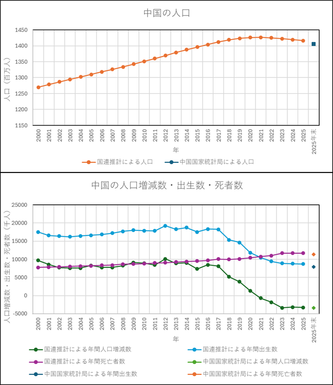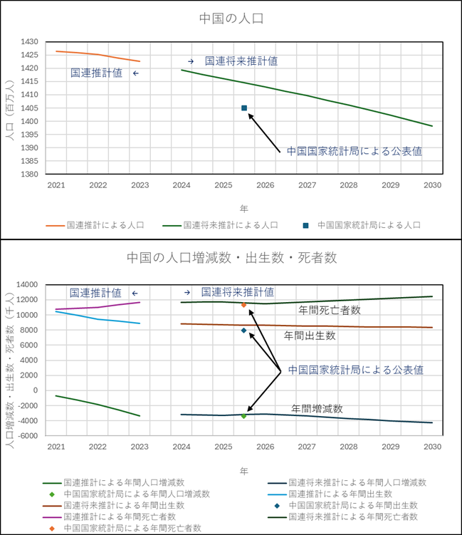 中国国家統計局の2025年末の人口、年間出生数、年間死亡者数がそれ以前の国連推計値に比較して、減少していることがわかるでしょうか。