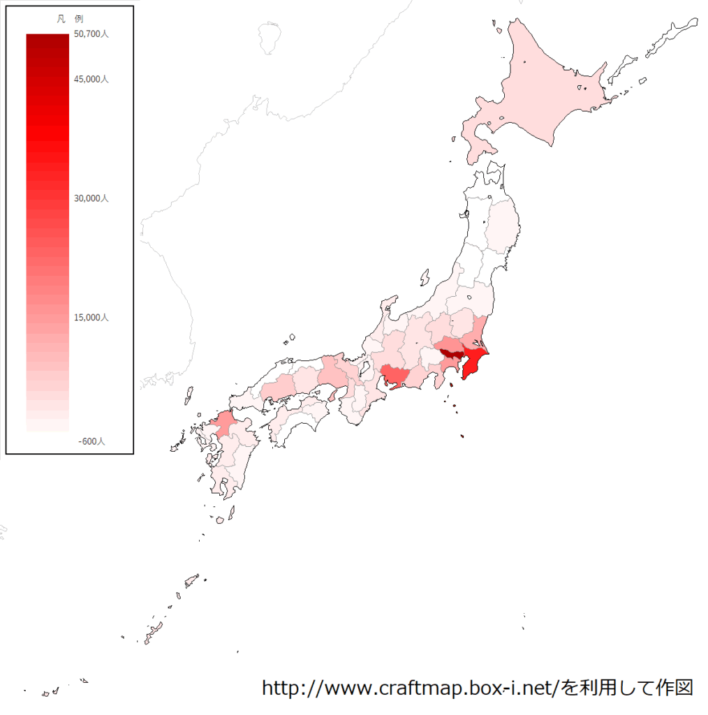 こちらもやはり東京都(5万0609人)が多いですが、2位の千葉県(3万3524人)との差は1万7000人程度であり、社会増減数ほど2位との差が開いてはいません。