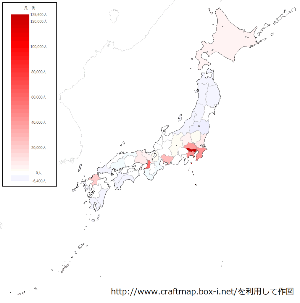 広域で見ると東京都を中心にその周辺の関東地方各県の社会増加が顕著であり、大阪府とその周辺がこれに続き、愛知県、福岡県、北海道はそれぞれ単一の道県で増加していることがわかります。